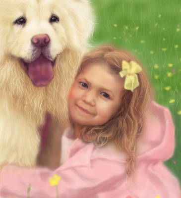 在這幅畫作中,每一個眼神、每一道表情、每一絲微妙的性格特質都被完整保存——從女孩眼中略帶調皮的神采,到小狗溫柔而忠誠的陪伴。